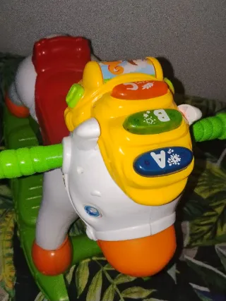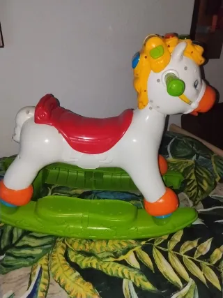 Caballo balancín de colores vivos, ideal para los más pequeños. Cuenta con detalles interactivos que estimulan el aprendizaje. - Diseño de caballo con asiento. - Detalles en color rojo, amarillo y verde. - Elementos decorativos y botones. - Base mecedora que se quita y tiene ruedas