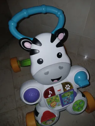 El andador correpasillos bebé Cebra parlanchina de Fisher-Price es un juguete diseñado para apoyar el desarrollo de habilidades motoras. Ofrece dos modos de juego: uno para jugar sentado, que incluye un libro con páginas móviles y botones que activan canciones y frases sobre letras y números, y otro para jugar de pie, donde el andador motiva al niño a caminar con frases y música. Cuenta con un asa fácil de agarrar y una base robusta con cuatro ruedas que proporciona estabilidad. Las actividades manuales fomentan la motricidad fina, mientras que los elementos visuales y táctiles estimulan los sentidos. Medidas: 40 (ancho) x 10 (alto