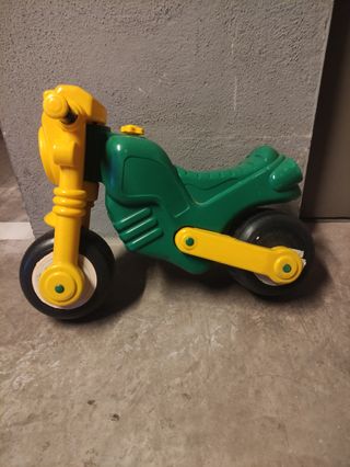 Moto correpasillos de plástico para bebés y niños. Bastante uso, lleva cinta americana negra en los manillares (ver fotos). Color amarillo y verde. Entrega en mano en Cornellà.