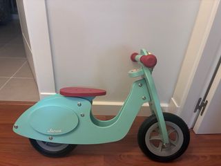 Moto de equilibrio de madera de la marca, ideal para los más pequeños. - Color verde menta y detalles en rojo. - Asiento rojo. - Ruedas negras de goma
