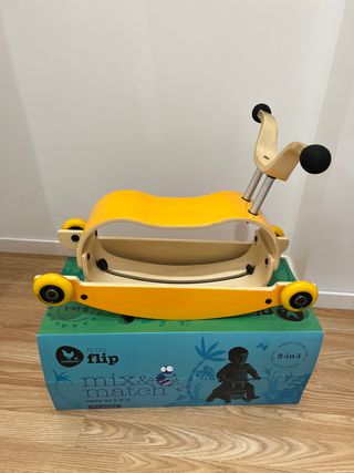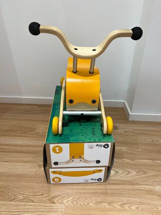 Mini-Flip de Wishbone es un producto 3 en 1 que se va transformar según tu hijo crece. Empezará a los 9 meses con un andador que podrá empujar por el pasillo de casa, luego se puede transformar en un balancín para terminar siendo un corre pasillos Este modelo está compuesto por 3 piezas Pieza 1 TOP Pieza 2 BASE Piezas 3 RUEDAS CARACTERÍSTICAS: Material: Madera de álamo, aluminio acero con ruedas de patín PU Altura asiento balancín: 21cm Altura asiento correpasillos 23.5cm Ruedas de 7 cm de diámetro Rodamientos de acero Fácil de montar Para niños entre 9 meses y 3 años.