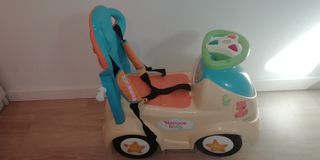 Correpasillos, con accesorios para que pueda ser conducido por un adulto y el niño/a no lleve los pies en el suelo, o para que sea un balancín. Compartimento bajo asiento para guardar juguetes, y cinturón de seguridad para evitar caídas.