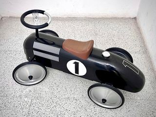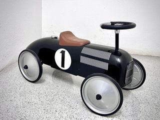 Este correpasillos de estilo retro evoca la nostalgia de los coches de carreras clásicos. Su diseño en negro brillante con detalles en plateado y el número 1 le dan un toque distintivo. - Diseño inspirado en coches de carreras vintage. - Asiento marrón acolchado. - Ruedas plateadas con detalles negros. - Volante negro. - Detalles de rejilla en la parte delantera y líneas blancas en el capó.