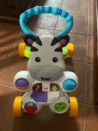 Correpasillos con forma de cebra de la marca Fisher Price. Ideal para que los más pequeños aprendan a caminar. - Diseño divertido de cebra. - Mango de agarre azul. - Ruedas de color naranja. Habla en frances