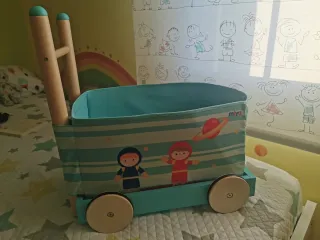 Carrito correpasillos con diseño infantil, ideal para guardar juguetes. - Estructura de madera y tela. - Ruedas de madera. - Diseño con temática espacial y astronautas. - Asa de madera para empujar. Precio original 34.95 euros