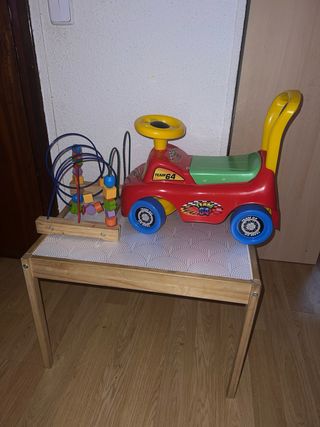 Conjunto de mesa infantil con un divertido correpasillos y un juguete de cuentas. - Mesa y silla de madera con superficie decorada. - Correpasillos rojo con volante amarillo y asiento verde. - Juguete de cuentas de colores con alambre.