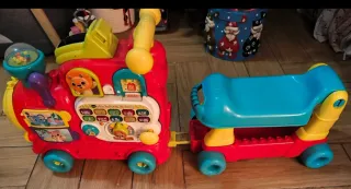 Se vende correpasillos tren VTech para bebés. Está en buenas condiciones, aunque presenta algunas señales de uso. - Incluye vagón de carga. - Dispone de un panel de actividades con botones y sonidos. - Ideal para que los más pequeños se diviertan y desarrollen sus habilidades motoras.