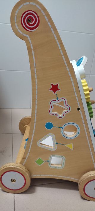 Andador de madera para bebés con múltiples actividades. - Diseño con ruedas para facilitar el movimiento. - Panel de actividades con engranajes, laberintos y cuentas. - Incluye formas geométricas para encajar. Tiene alguna marca de uso como se aprecia en las fotos.