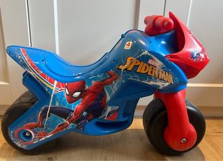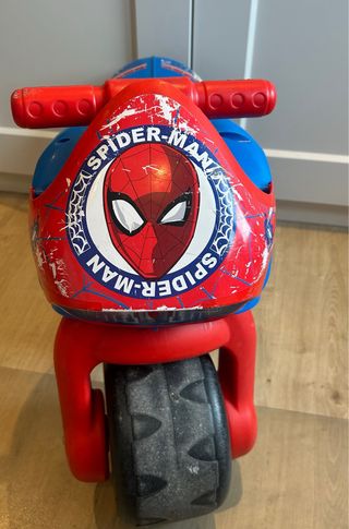 Moto correpasillos INJUSA con diseño de Spiderman. - Color azul y rojo. - Decoración de Spiderman. - Ruedas de plástico. Con evidentes signos de desgaste pero con nada roto.