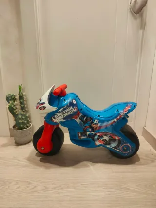 Correpasillos infantil con diseño de Capitán América. Ideal para los más pequeños. buen estado - Diseño azul con gráficos de Capitán América. - Ruedas negras. - Manillar rojo.