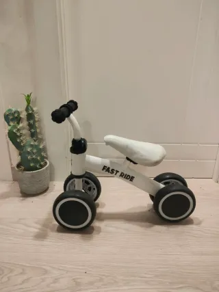 Correpasillos de cuatro ruedas con diseño moderno y divertido. Ideal para los primeros desplazamientos de los más pequeños. buen estado - Color blanco con detalles en negro. - Ruedas de goma. - Asiento cómodo.