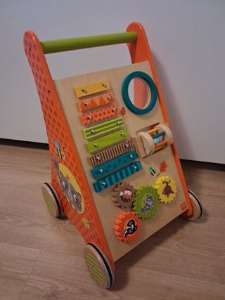 Andador correpasillos de madera es perfecto para los primeros pasos de los más pequeños. - Diseño colorido con motivos de animales y naturaleza. - Incluye xilófono, ruedas giratorias y espejo. - Fabricado en madera resistente y segura. - Marca eurekakids - Com alguna marca o raspón de uso