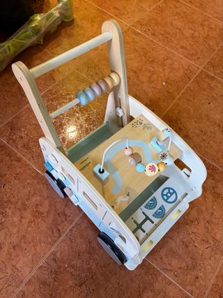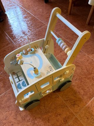 Correpasillos de madera con múltiples actividades para el desarrollo infantil. - Diseño colorido con dibujos de animales. - Incluye xilófono, ruedas dentadas y ventanita. - Mango de madera para sujetarse. - Muy estable. - Ruedas de madera con cubierta de goma. - Pequeñas rozaduras en la pintura a la altura de las ruedas.