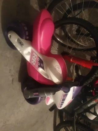 Moto correpasillos en colores morado y fucsia. Ideal para que los más pequeños se diviertan, de plástico resistente. Usada pero bien conservada. Precio cerrado.