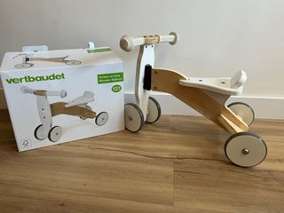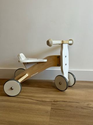 Correpasillos de madera de la marca Vertbaudet, ideal para los más pequeños. Desde 12 meses hasta 3 años. Desarrolla el equilibrio y la motricidad. - Diseño en madera y blanco. - Ruedas grises. DEFECTOS: Le falta un tornillo para unir las ruedas traseras. La parte que une el manillar no queda bien sujeta, a pesar de girar bien los tornillos.