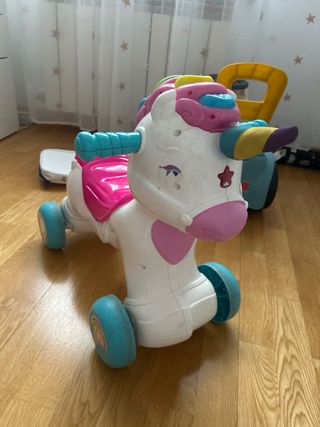 es un dos en uno lo puedes poner de andador y luego para montarse tiene musica está en perfecto estado solo le falta como una pieza que era de plástico tipo retrovisor que no lo encuentropor lo demás todo perfecto de Imaginarium