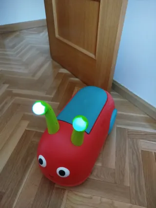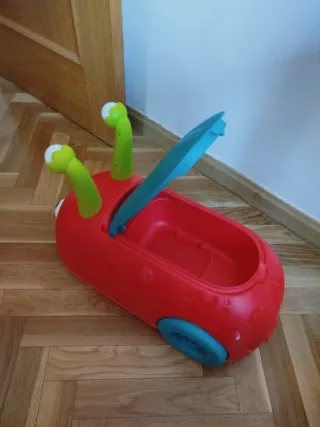 Divertido correpasillos con forma de oruga para los más pequeños. Su diseño alegre y colorido captará su atención. - Color principal: rojo. - Detalles en azul y verde. - Antenas con luces. - Ruedas azules. Un solo uso por estar en casa de mis suegros.