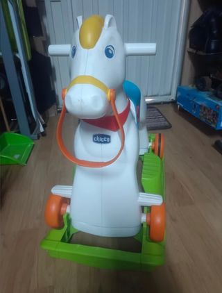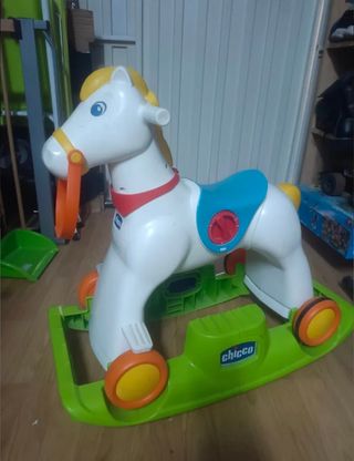 Caballo balancín con sonido de la marca Chicco que permite 3 modos de juego: Balancin, galope y correpasillos. Juguete adecuado para niños/as de diversas edades, que una vez retirado de su base puede ponerlo en posición correpasillos