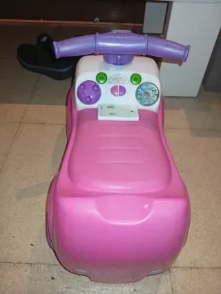 Correpasillos de color rosa con detalles blancos y morados. Presenta pegatinas de personajes de Disney. Lode los sonidos no funciona precio no negociable no ago envios - Diseño infantil. - Ruedas moradas. - Volante morado.