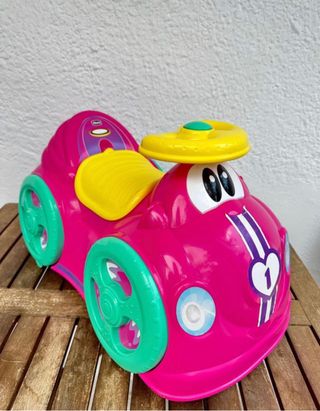 Correpasillos Chicco de color rosa brillante con detalles en amarillo y verde. - Diseño inspirado en un coche de carreras. - Volante amarillo con botón central verde. - Sonido de claxon. - Asiento amarillo. - Ruedas verdes con detalles. - Adornos de rayas moradas y blancas con un corazón y el número 1. - Maletero. - Opción de acoplar una barra para ser guiado por el adulto