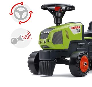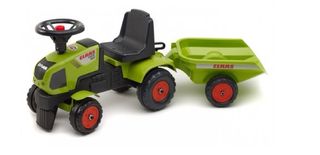 Original correpasillos, tractor Claas con remolque desmontable. Volante con claxon. Ruedas recauchutadas. Dimensiones: 97x30x37