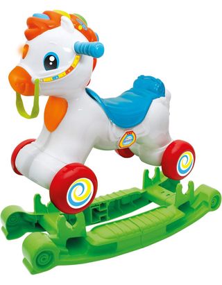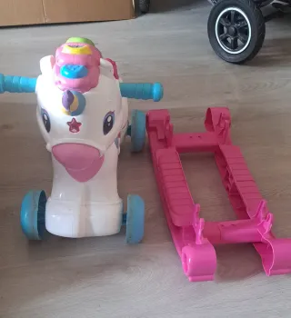 Un divertido unicornio balancín que también se puede usar como correpasillos. - Diseño blanco y rosa. - Melena y cuerno multicolor. - Ruedas con espiral en azul y verde.