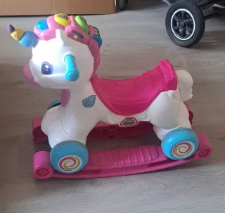 Unicornio balancín para los más pequeños. - Diseño de unicornio blanco y rosa. - Asiento cómodo. - Base balancín. - Ruedas para convertirlo en correpasillos.