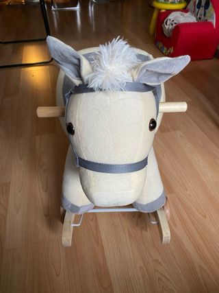 Caballito balancín con asiento acolchado y cinturón de seguridad. También tiene la función de correpasillos, las ruedas se pueden subir y bajar. Muy buen estado, poco uso. - Diseño suave. - Base de balancín de madera. - Ruedas de madera. Las medidas son: 50cm (alto) x 60cm (largo) x 35 (ancho)