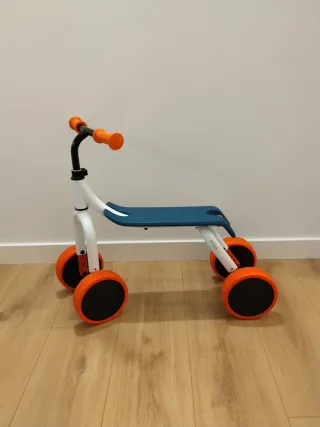 Correpasillos evolutivo de cuatro ruedas, ideal para los primeros desplazamientos. - Diseño en color blanco y azul. - Ruedas de color naranja con centro negro. - Manillar con puños naranjas. Original de Decathlon. Perfecto para regalo de Reyes.