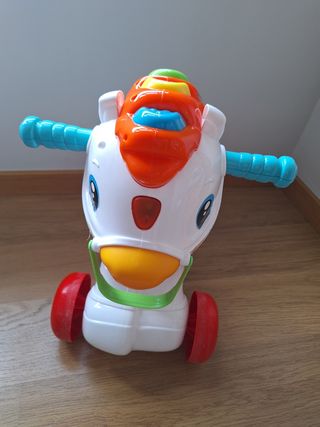 Correpasillos de la marca Playskool con un diseño divertido y colorido. - Asiento amarillo. - Ruedas de colores: verde, morado y amarillo. - Volante con figura de animal naranja. - Con melodía al sentarse hace sonidos