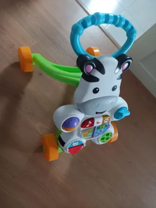 Correpasillos con forma de cebra, ideal para los primeros pasos. - Diseño colorido con detalles de cebra. - Mango azul para sujetar. - Ruedas naranjas y verdes.