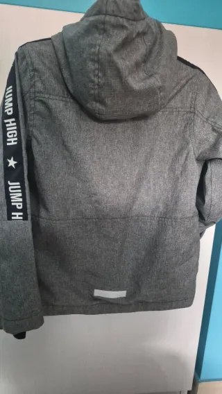 Chaqueta gris para niño, ideal para entretiempo. Presenta un diseño moderno con detalles en las mangas. - Capucha integrada. - Cierre de cremallera frontal. - Bolsillos laterales. - En perfecto estado