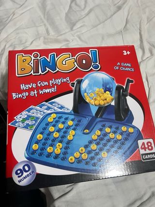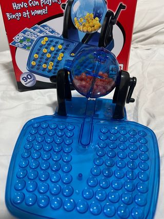 Juego de bingo completo con máquina y bolas. - Máquina de bingo de plástico azul. - Incluye bolas de bingo de colores. - Bandeja para colocar las bolas.