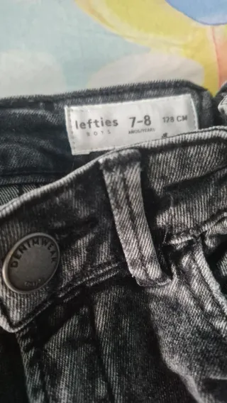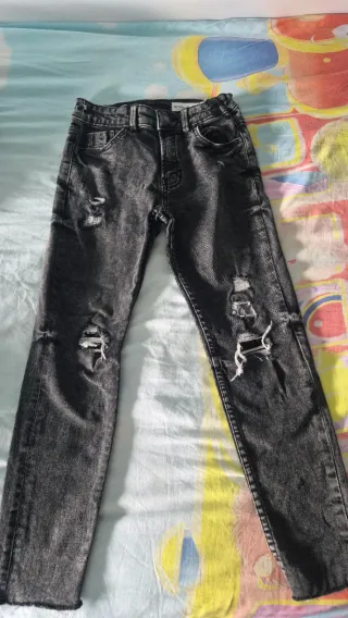 Pantalón vaquero para niño con un moderno diseño desgastado y rotos. - Color gris oscuro. - Cintura elástica. - Estilo desgastado con rotos. - Bajo deshilachado. - Talla 7-8