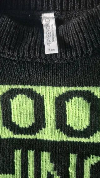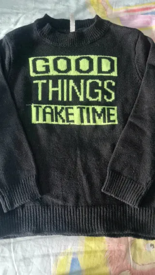 Jersey de punto negro para niño con mensaje. - Diseño con texto GOOD THINGS TAKETIME en color verde neón. - Cuello redondo y manga larga. - Puños y bajo de canalé.