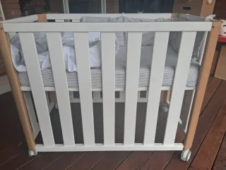 Minicuna colecho marca DOCO Sleeping, modelo Sleeping. - Medidas: 50x90cm. - Diseño moderno con estructura de madera y barrotes blancos. - Incluye edredon de la misma marca, protección del lateral y colchon
