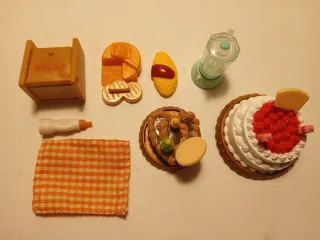 Set de comida y accesorios para Sylvanian Families. - Incluye panera, quesos, pan, pastel, licuadora y mantel. - Ideal para complementar tus escenarios. Para completar piezas perdidas o añadir a tus Sylvanian Families favoritos. Están como nuevos. Preguntame por el precio de lo que te interese.