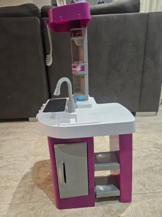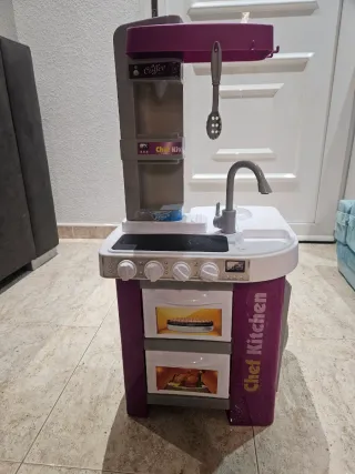 Divertida cocina de juguete con diseño moderno y colorida. - Incluye cafetera y fregadero. - Estufa con mandos. - Horno con imágenes de comida. - Colgador para utensilios.