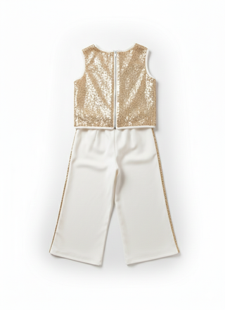 Conjunto de dos piezas para niña, ideal para ocasiones especiales. - Top sin mangas con lentejuelas doradas. - Pantalón blanco de corte ancho. - Detalle de lentejuelas doradas en los laterales del pantalón.
