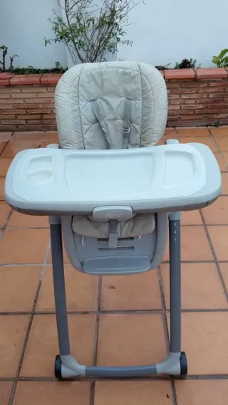 Trona de bebé de la marca Joie, ideal para las comidas. - Asiento acolchado. - Bandeja extraíble. - Arnés de seguridad. - Altura ajustable. - se convierte en asiento con pupitre