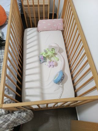 Cuna de bebé de madera clara comprada en Ikea hace 6 meses. La niña literalmente ha dormido 5 veces, todo lo demás con mama y papa en la cama grande jaja Medidas: 120x60cm Está completamente nueva e incluye un colchón comprado a parte que tampoco está usado. Si se puede comprar así montada mejor, si no hay otra opción la desmontaría. Precio cuna: 70€ en Ikea Precio colchón: 30€ en Amazon No dudéis en preguntar ;)