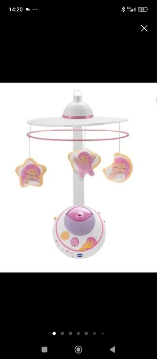 Carrusel para cuna de la marca Chicco en rosa y blanco. - La música funciona pero el proyector a ratos, quizá sean las pilas. Ha estado guardado porque apenas se utilizo. - Incluye figuras colgantes con temática infantil. - Se entrega desmontado en su caja.
