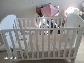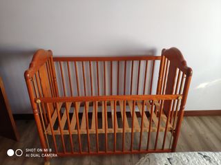 Cuna para colchón 60x120cm. Acabado madera. Ruedas para poder moverla.En perfectas condiciones. Colchón de muelles en perfecto estado incluído.