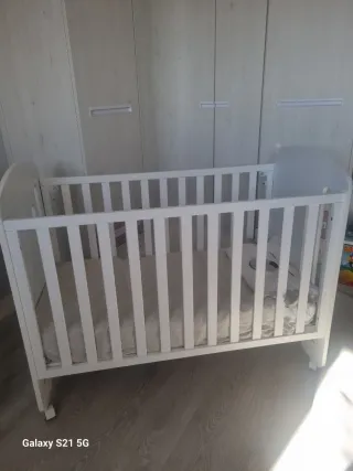 Cuna modelo Doco de Cotinfant en color blanco y madera, con medidas de 60x120 cm. Incluye colchón básico. - Diseño moderno y funcional. - Estructura de madera y barrotes blancos. - Ruedas para facilitar su movilidad. En buen estado, signos de desgaste que se ven en fotos. Le faltan las cintas de colecho, solo tengo la madera y la espuma, por eso no se adjunta en el anuncio. se entrega montada o desmontada, se recoge en domicilio, no hago envíos