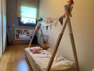 Cama infantil con diseño de tipi. Somier de madera +colchon, inspirada en la pedagogía Montessori. - Estructura de madera. - Diseño de tipi. Medias 79x148. Para colchon de 70x140. Se vende aparte: Colchón Descripción My Baby Mattress para bebé, tamaño 70x140 cm. Esta en pertecto estado. reversible para invierno y verano. Precio 40€. Dos sacos Nordicos de muy buena calidad. Precio 25€ cada uno. Uno de la marca “petitpraia” valor 99’90€ REGALO PROTECCIÓN DEL COLCHON +RELLENO NORDICO VALOR TOTAL APROXIMADO 385€