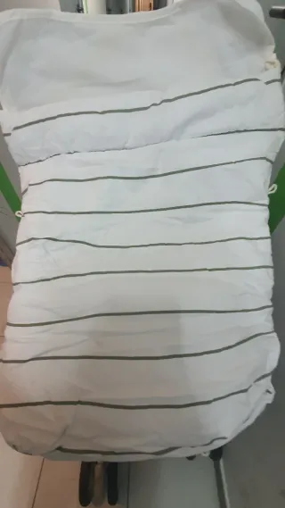 Saco para minicuna de la marca Babyhome. Con un diseño de rayas verdes sobre fondo blanco. - Tejido suave y confortable. - Cierre con cremallera. - Ideal para mantener al bebé abrigado.
