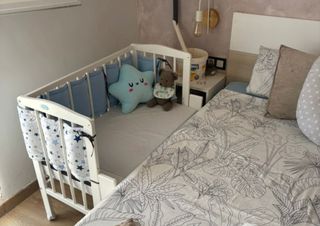 Ideal para tener al bebé cerca durante la noche. Medidas 90x50 cm. Tiene posibilidad de convertirse en sofá infantil como aparece en las imágenes. Precio original 310€. - Diseño moderno y seguro. - Fácil de montar y desmontar. - Ruedas para moverla fácilmente. Incluye: - Colchón antiahogo. - Dos sábanas bajeras protectoras impermeables. - Dos sábanas bajeras blancas. - Edredón nórdico con dibujo de estrellas. - Protector cuna chichonera gris a estrenar. Desperfectos: La cuna está en buen estado, pero le falta un lateral. Esto no es problema si la idea es hacer colecho. Las ruedas no frenan bien, pero hay posibilidad de quitarlas