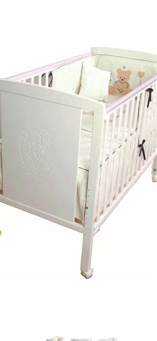 Cuna de bebé en color blanco, de 120cm x 60cm, ideal para el descanso del recién nacido. Incluyo protector de barrotes. Tiene tres alturas (una de ellas hecha por nosotros para usarla como cuna colecho y adaptarla a la altura de nuestra cama). Tiene algunas marcas de uso, como se puede apreciar en la última foto. Precio negociable (nueva cuesta 150€).