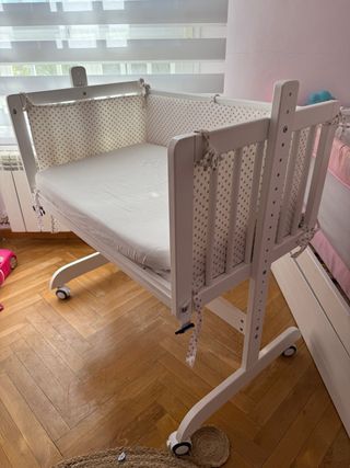 Cuna de colecho blanca, ideal para tener al bebé cerca. - Estructura de madera blanca. - Laterales con barrotes. - Uno de los laterales se quita con fácil sistema para hacer colecho, al ser regulable en altura queda como continuación nuestra cama. - Incluye colchón. - Base con ruedas para facilitar el movimiento.