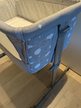 Cuna de colecho de la marca Chicco en color gris. Permite tener al bebé cerca durante la noche. - Laterales de malla transpirable. - Altura regulable. - Ruedas para facilitar el movimiento. Esta como nueva, con su bolsa de transporte original (ver foto todo guardado en ella). Tiene una mancha muy pequeña en un lateral, de chocolate de nuestra hija mayor, no he voseguido quitarla :-(